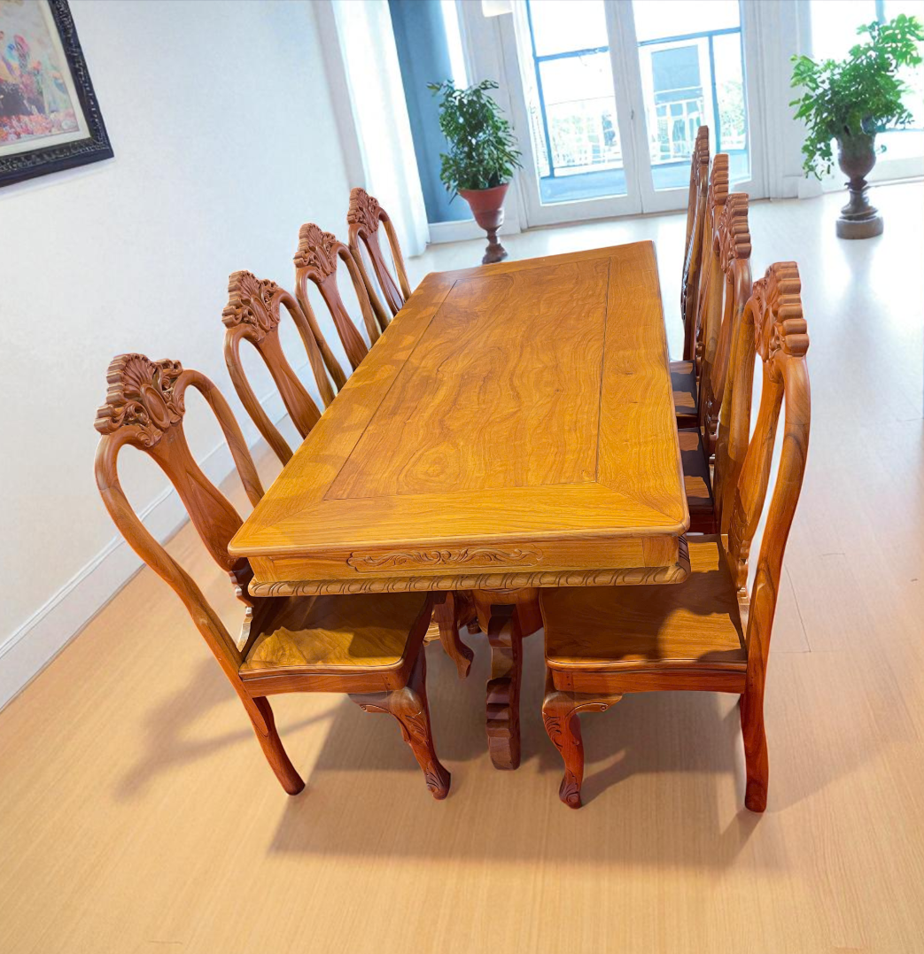 Với thiết kế mặt bàn chữ nhật 1m94 x 94cm, cao 76cm kết hợp cùng 8 ghế Louis giọt nước, sản phẩm mang trọn vẹn tinh hoa gỗ tự nhiên – vừa bền vững, vừa kiêu hãnh, nâng tầm không gian phòng ăn thành nơi hội tụ sang trọng và quyền quý.