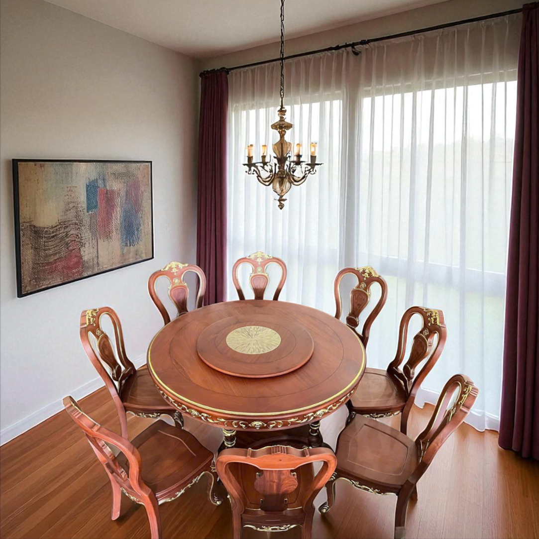 ✅ Mặt bàn dày, bo cạnh tròn mềm mại, chân trụ chạm khắc hoa văn đơn giản nhưng tinh tế. Bàn tròn mâm xoay gõ đỏ Lào không chỉ là một sản phẩm nội thất thông dụng mà còn là điểm nhấn tạo nên giá trị thẩm mỹ cao cho phòng ăn hoặc khu vực tiếp khách.