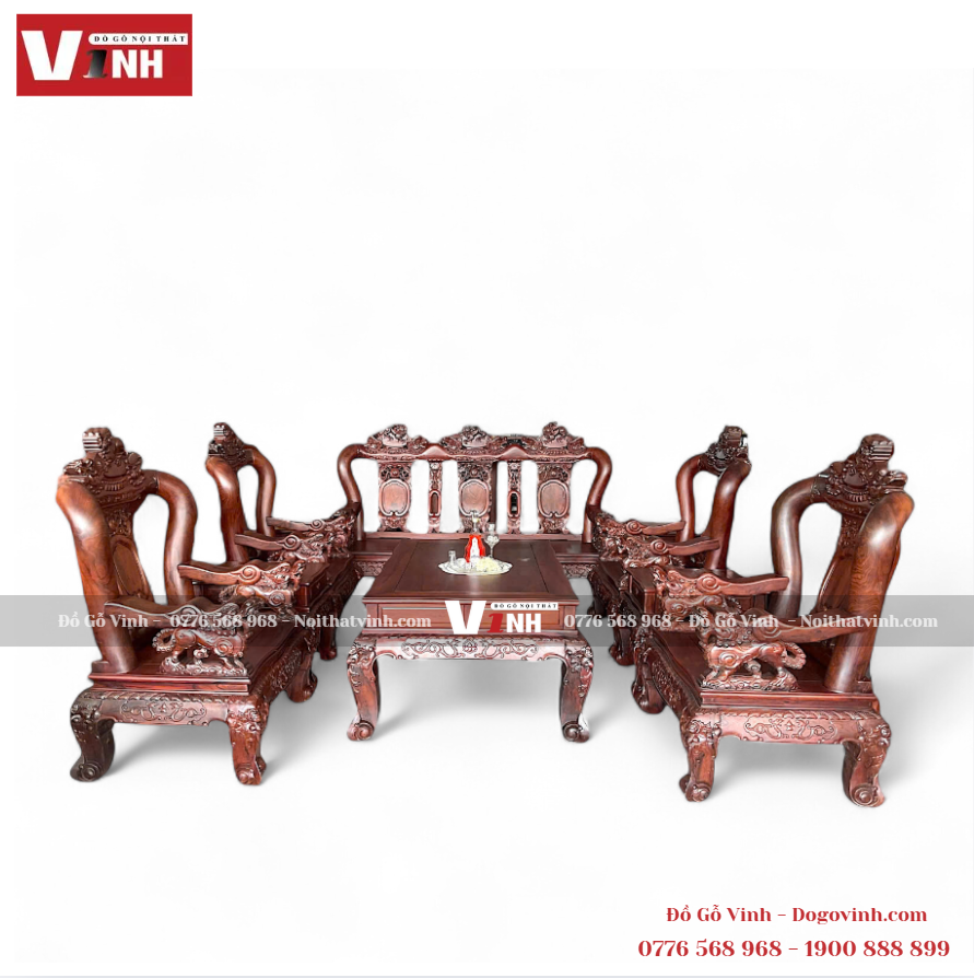 Bộ bộ ghế 12 Nghê nổi bật với những đường nét chạm trổ hình linh vật Nghê uy nghi, biểu tượng của sự quyền lực và may mắn.