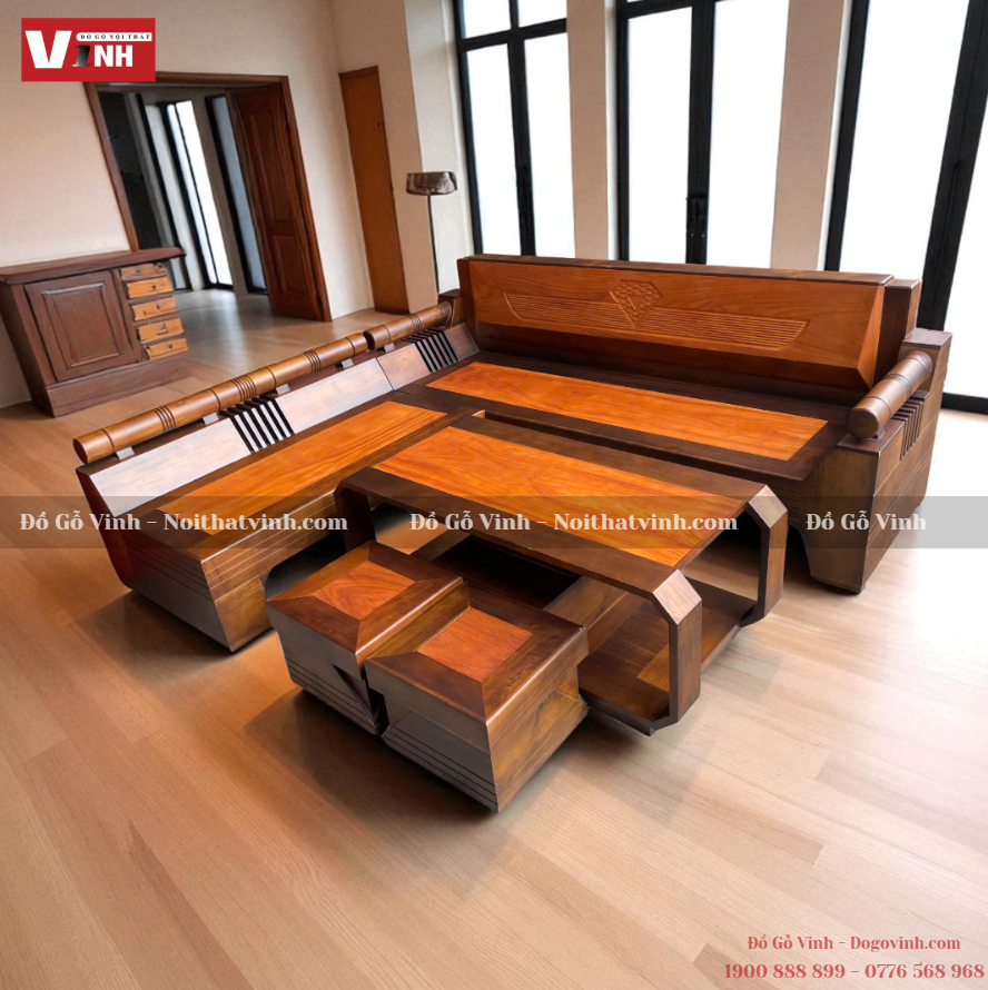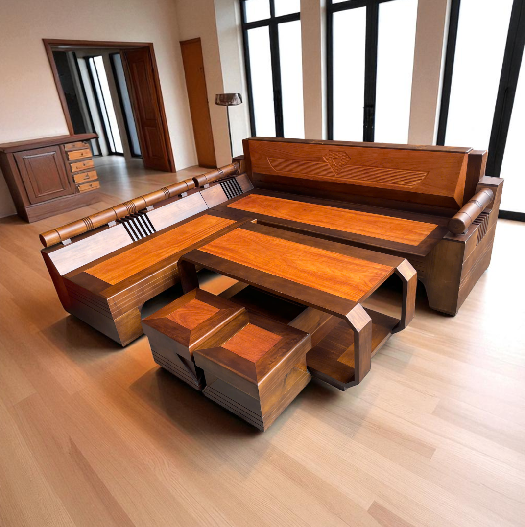 Bộ ghế góc L 5 món gỗ tràm gõ được thiết kế theo dáng góc hiện đại, vừa tiết kiệm diện tích, vừa mang lại sự ấm cúng cho phòng khách. Chất liệu gỗ tràm gõ tự nhiên nổi bật với vân gỗ đẹp, bền chắc, tạo cảm giác sang trọng, khẳng định đẳng cấp của gia chủ.