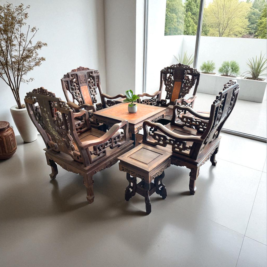 1 bàn, 4 ghế lớn và 4 đôn – được chế tác thủ công từ gỗ Trắc kết hợp gỗ Nu tự nhiên cao cấp.